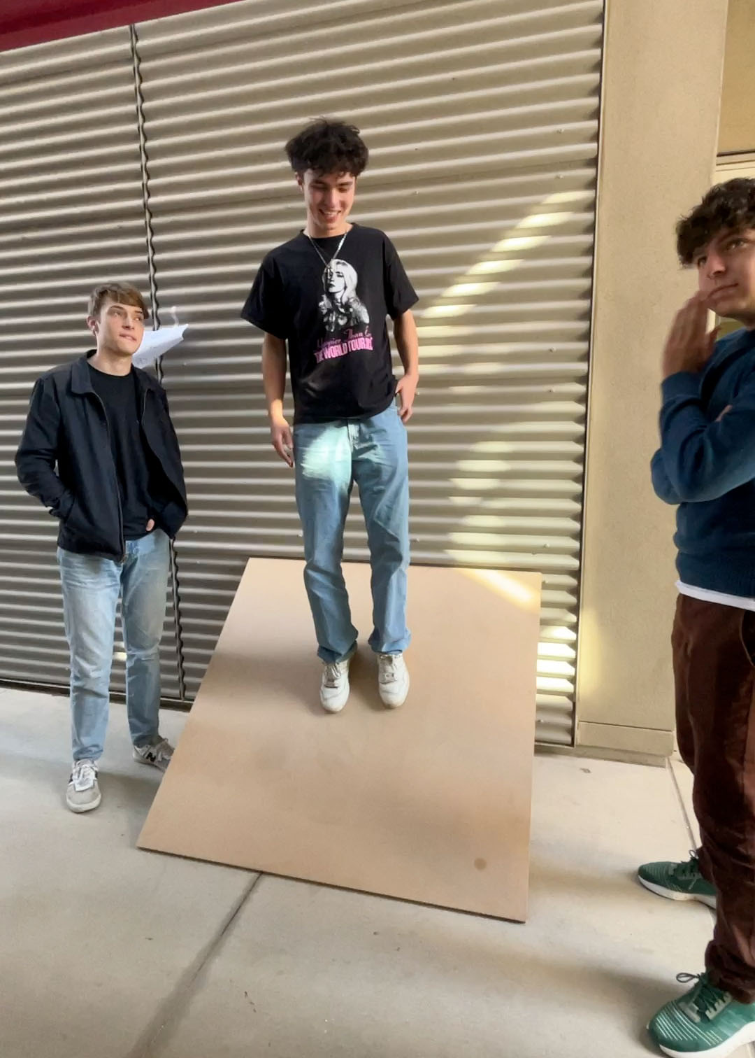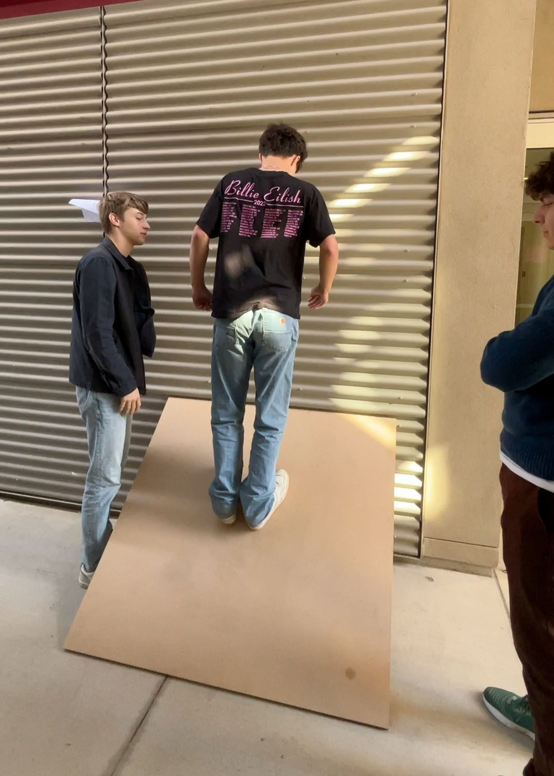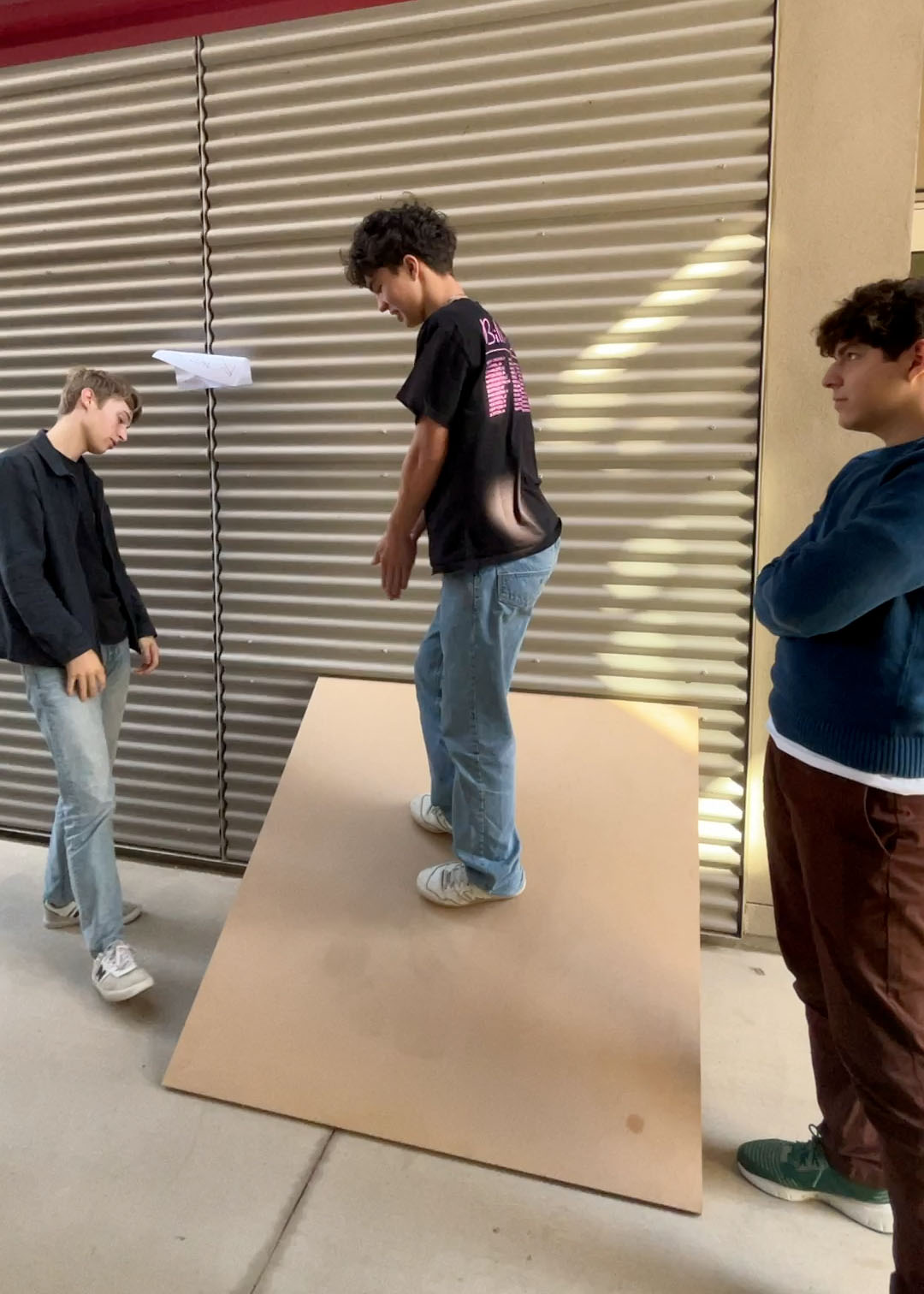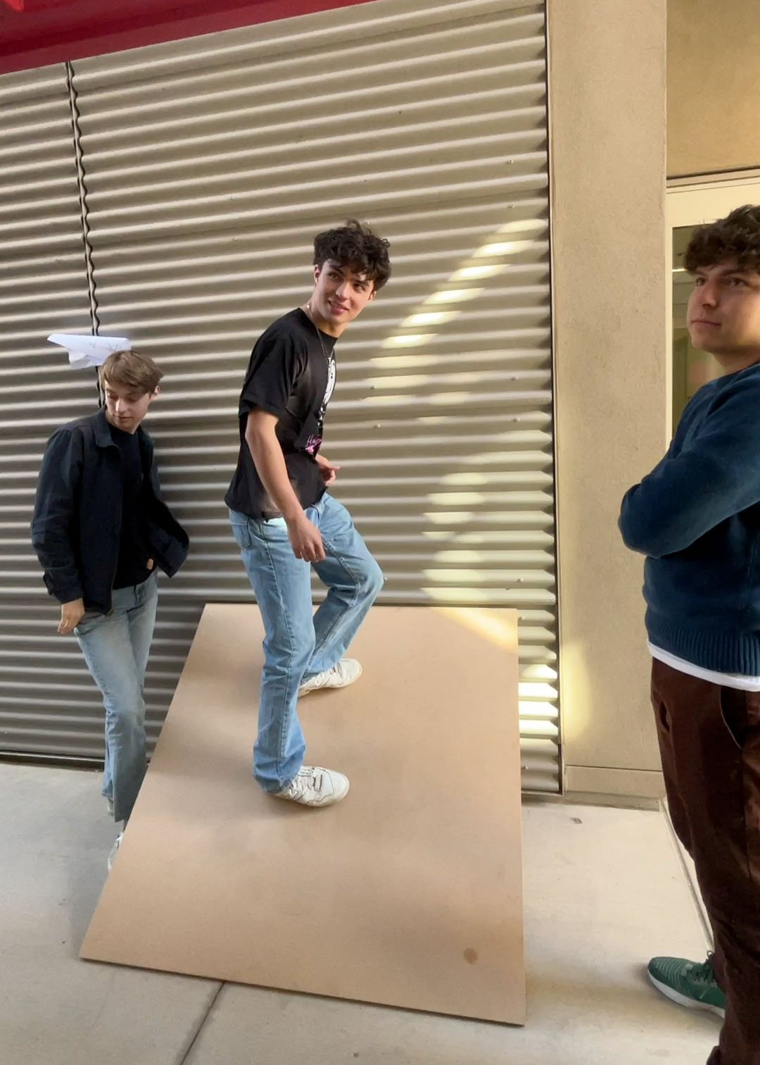 We started our investigation of slopes in higher dimensions by doing what Kelly Poon ’24 called a “ritual sacrifice.” We marched outside, found a piece of plywood propped up on the wall outside the i-Lab, and made Jaxon Jacobs ’24 stand on it. Standing on the plywood, in the center, facing the wall, it’s pretty steep!!!