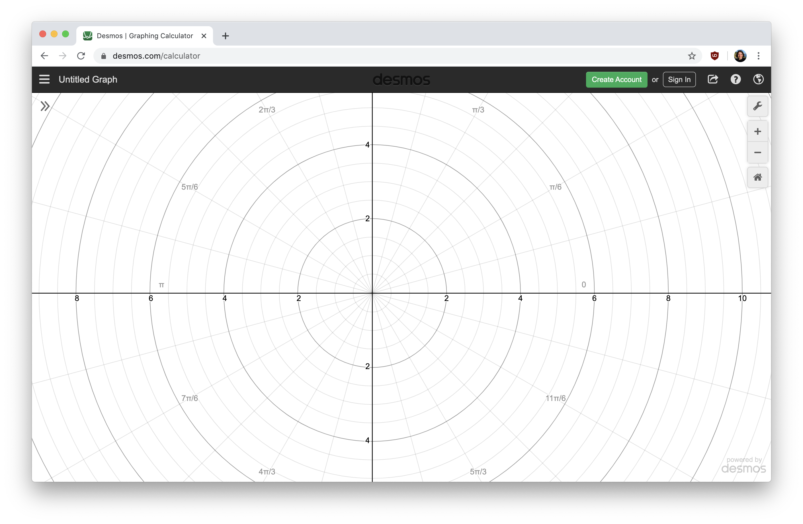 Our traditional way of describing numbers we normally call rectangular or Cartesian1 coordinates. This new way of describing numbers we call polar coordinates, because if we make a graph on which the lines represent not constant left-right and up-down distance from the origin, but constant angle and radius from the origin, we get something that looks like a top-down or bottom-up view of the earth from one of the poles (looking at the lines of latitude and longitude). If you’ve played around with the settings in Desmos, you may have stumbled across it: