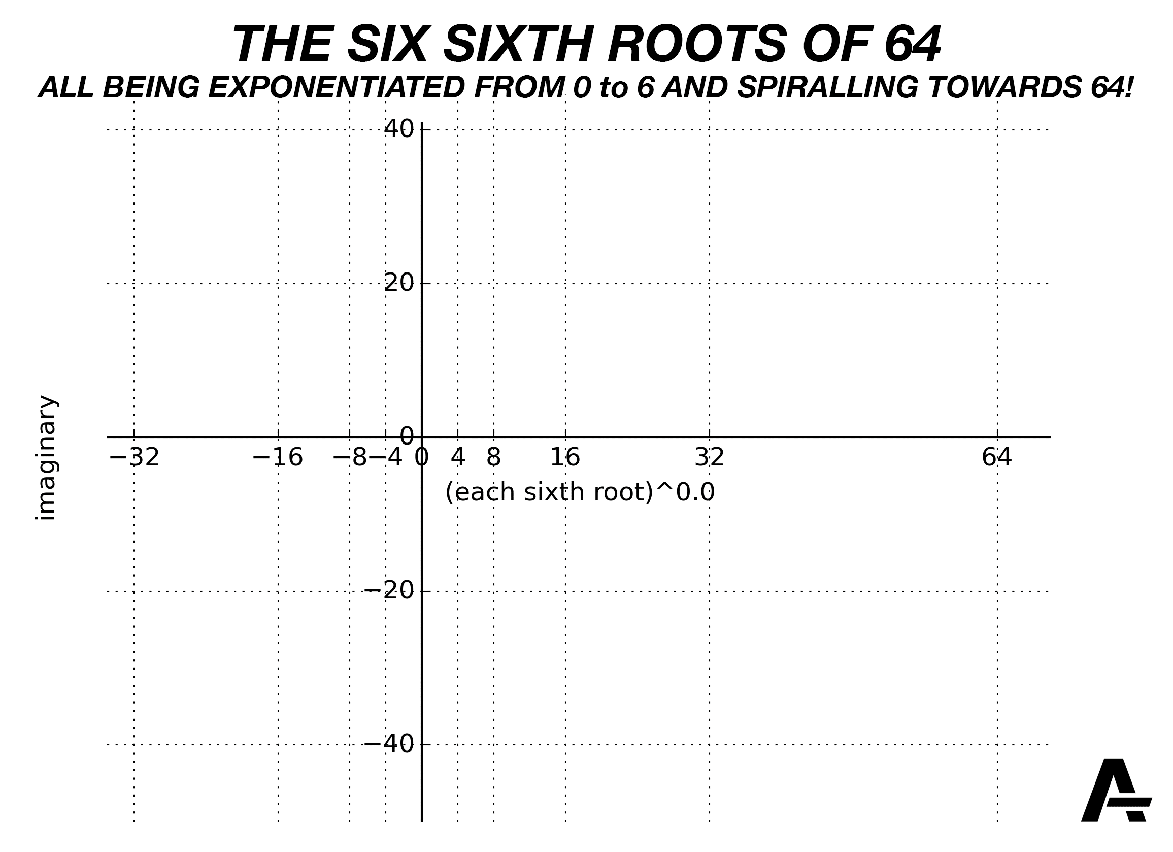 | \(\sqrt[6]{64}\cdot\sqrt[6]{64}\cdot\sqrt[6]{64}\cdot\sqrt[6]{64}\cdot\sqrt[6]{64}\cdot\sqrt[6]{64}=\left(\sqrt[6]{64}\right)^6\) | \(=+64+0i\) | \(64\) | \(360^\circ\) |